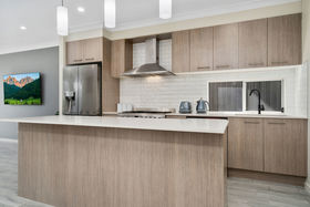Contemporary kitchen with gas cook top, stainless steel appliances, dishwasher, tiled splash back with window, pendant lighting, breakfast bar and ample storage/bench space